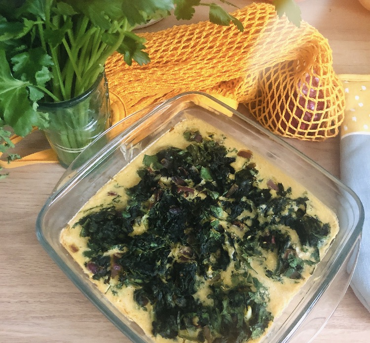 Il y a des endroits dans le monde dont on entend pas assez parler au niveau culinaire, et celui de ce 19 décembre en fait partie, puisqu’il s’agit de l’Azerbaïdjan et son fameux Kuku (se prononce kyukyu et pas cucu :)). Le kuku est plutôt considéré comme une entrée ou un apéritif, ce qui peut être intéressant pour une alternative originale et plutôt saine pour les repas de fêtes qui arrivent si vite! Le kuku se compose principalement d’herbes fraiches et d’oeufs, et comme vous vous en doutez bien, je ne vais absolument pas utiliser d’oeufs ( que je mange pourtant mais juste mollé, à la coque ou au plat, mais dans des recettes « transformées », je préfère utiliser des alternatives vegan).Je déroge à une autre règle, car je fais cuire mon kuku au four et non à la poêle. Pour les herbes, vous pouvez en utiliser des congelés surtout en cette saison où il n’est pas si aisé de tout trouver en frais bio. Je vous présente donc mon kuku revisité avec de la farine de pois chiche pour remplacer les oeufs et qui a aussi le mérite d’apporter de la protéine. C’est pas beautiful 😉 ?