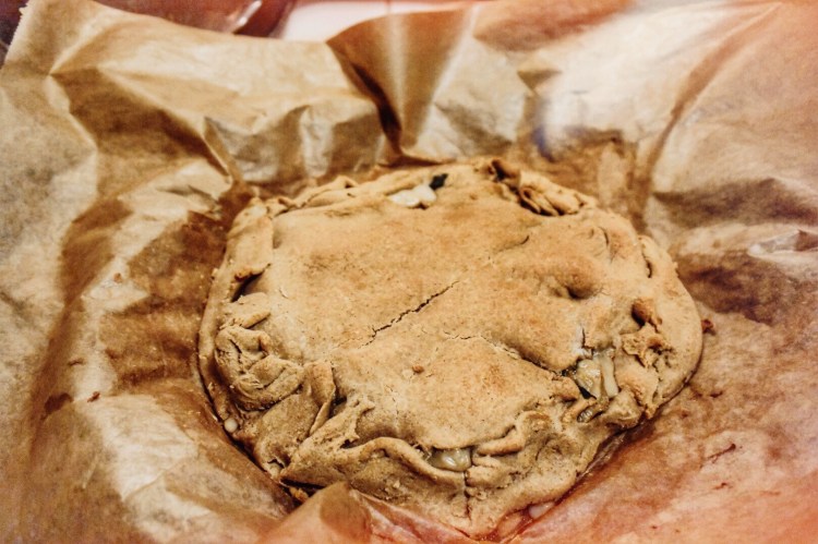 Sortez la pâte du réfrigérateur, coupez là en 2 ( normalement en 4, mais sans gluten cela est plus compliqué à mettre en oeuvre), étalez une première partie de la pâte très finement afin qu’elle corresponde à la taille de votre plat à tarte. Ajustez-la dans votre plat et ajoutez la garniture dessus, puis recouvrez avec la seconde partie de pâte étalée très fine également mais un peu moins grande que la taille de votre plat, et déposez dessus. Refermez en repliant les bords à la « rustique » et badigeonnez d’huile d’olive. Enfournez pour 20 minutes à 200C°.