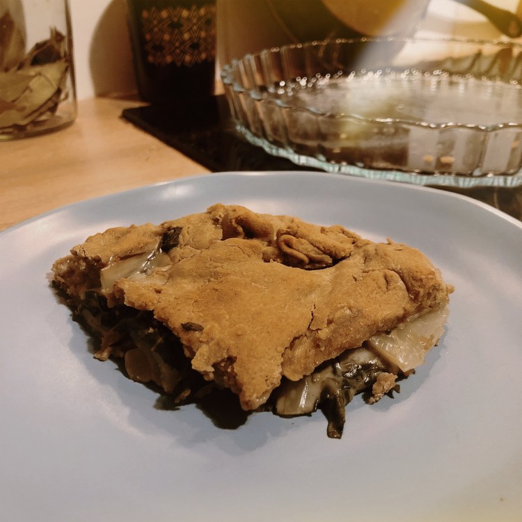 En ce 22 décembre, nous partons en Grèce découvrir cette spécialité à base de légumes verts, dont je raffole personnellement, il s’agit de l’Hortopita. L’Hortopita est une tourte verte garnie de légumes et herbes vertes dont très souvent des blettes. Elle contient traditionnellement de la fêta bien sûr, mais j’ai décidé de ne pas en mettre et de rendre cette tourte plus légère, bien que toujours consistante avec de la crème de noix de cajou qui n’a rien à envier aux béchamels et autres fromages, et une pâte sans gluten avec un mélange de farine de teff et farine de riz semi-complet, certes plus fragiles à travailler mais tellement plus digestes.
