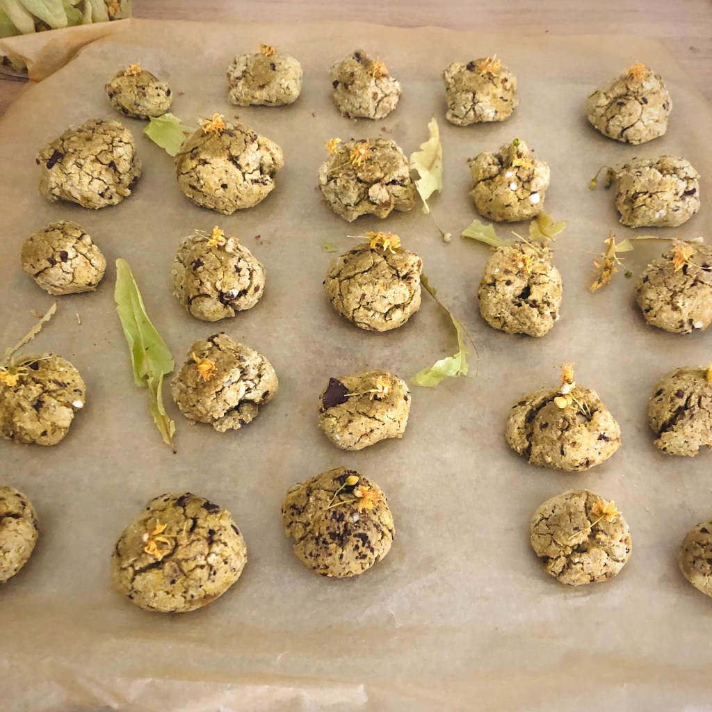 Dans un récipient mélangez les deux farines, le sucre et le bicarbonate. Puis ajoutez l’huile, les graines de lin, le lait végétal auquel vous ajouterez les fèves de cacao concassées, les copeaux de chocolat, les amandes et les graines de macadamia. Vous devez obtenir une pâte assez compacte que vous travaillerai à la main. Formez de petites boules que vous déposerez une à une sur la plaque de cuisson. Décorez selon vos envies et enfournez pour 10min thermostat 7.