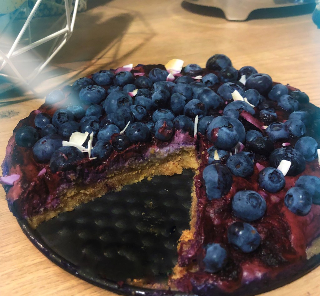 Ensuite toujours dans le blender préalablement nettoyé, ajoutez environ 100g de myrtilles, l’huile essentielles de vanille, la crème de coco et la cuillère à café de fleurs de lavande. Mixez afin d’obtenir un bel appareil que l’on viendra superposer sur la pâte qui reposait au réfrigérateur jusqu’alors. Ajoutez les myrtilles dessus ainsi que le toping de votre choix. Réservez le tout au minimum 6/8h au frais pour une bonne tenue du gâteau, avant de déguster.