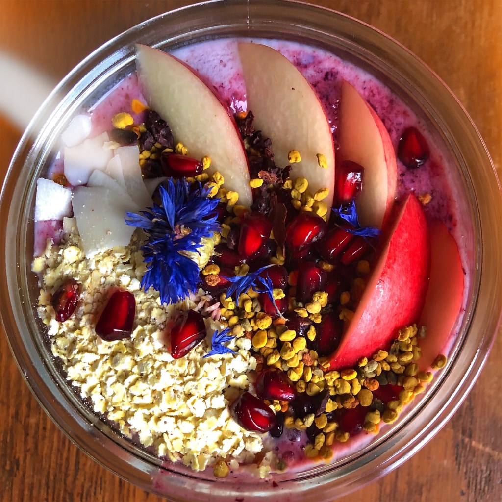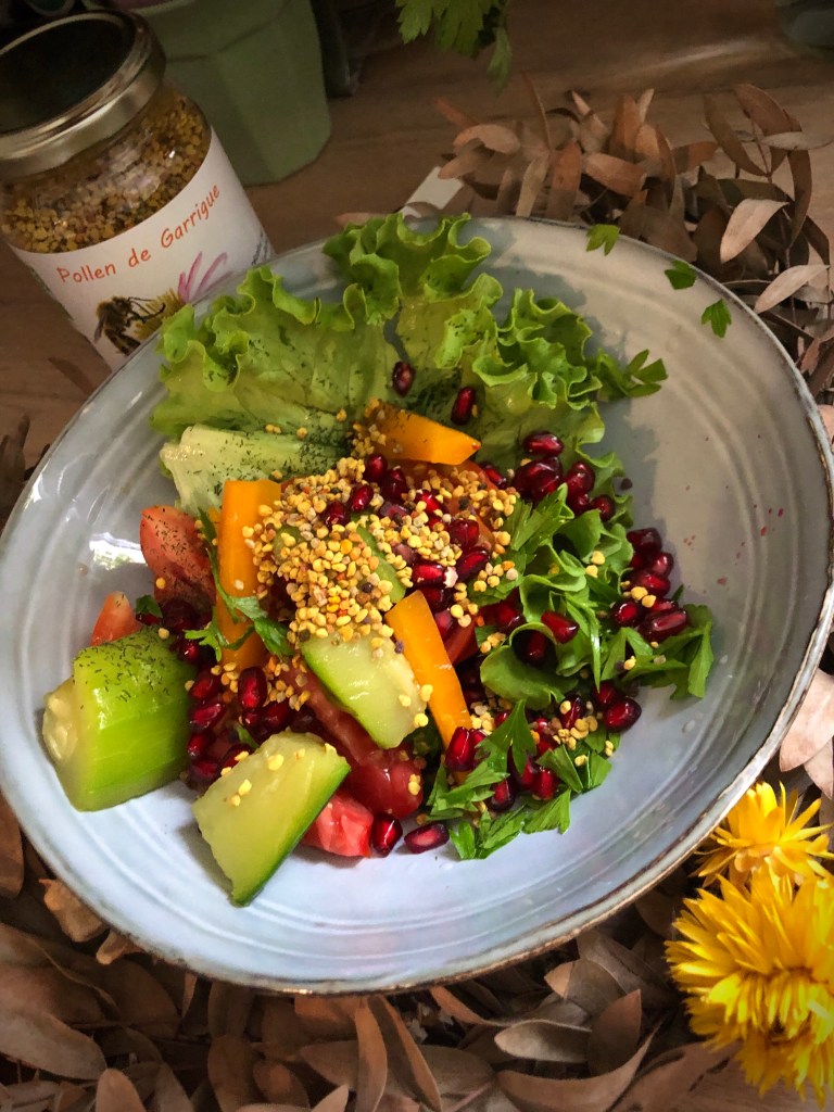 Vous pouvez faire une cure d’un mois à raison d’une grosse cuillère à soupe par jour que ce soit sous forme de pollen sec en bocal ou frais à garder au congélateur. Sinon vous pouvez en trouver en gélules si vous n’appréciez pas le goût. Personnellement, je l’adore, et le mets dans des salades sucrés/salés, dans des smoothies bowl, des compotes,… car idéalement pour profiter pleinement du potentiel du pollen il faut le consommer avec des fruits. Ça tombe bien en ce moment il y a de bonnes grenades par exemple, je trouve que l’association des deux est divine!