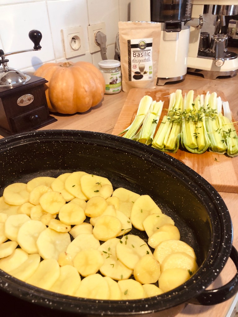 Coupez en rondelles vos pommes de terre 🥔, et coupez en 2 vos blancs de poireaux que vous recouperez en 2 dans la longueur. Huilez avec un peu d’huile de coco un fait tout ( type roaster) et disposez les rondelles de pommes de terre 🥔 sur tout le fond. Ajoutez par dessus le thym citronné. En parallèle mélangez vos graines de basilic dans la crème de coco, et une fois qu’ils deviennent translucides, ajoutez dans la préparation précédente. Ajoutez les noisettes concassées et refermez votre ustensile. C’est parti pour 25 minutes à 180C au four, puis pour un bon repas.