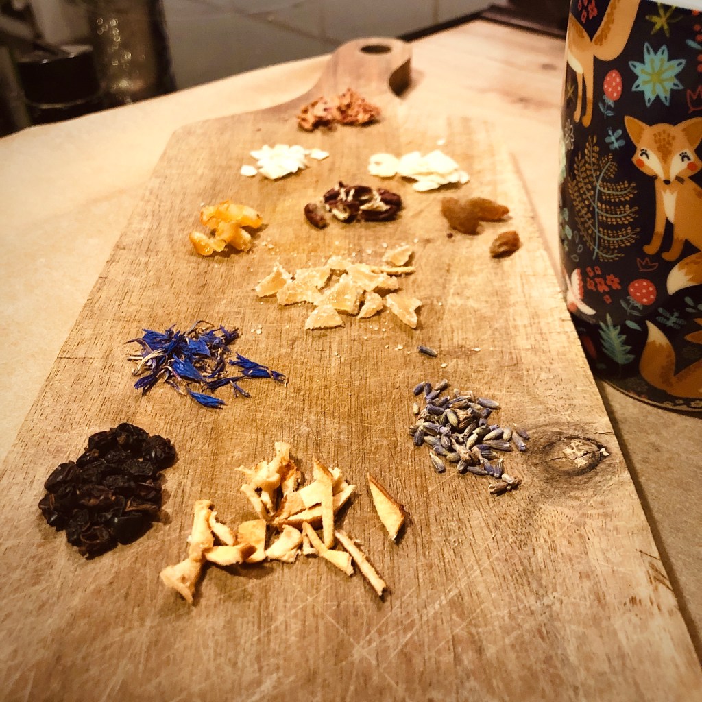 – des fleurs séchées comestibles ( bleuets, lavandes, roses, mauve,…), des épines vinettes, des amandes effilées, des copeaux de noix de coco, des noix de pecan, du gingembre confits, des orangettes, des raisins secs verts, de la pomme séchée… voilà ce que j’ai utilisé personnellement ici