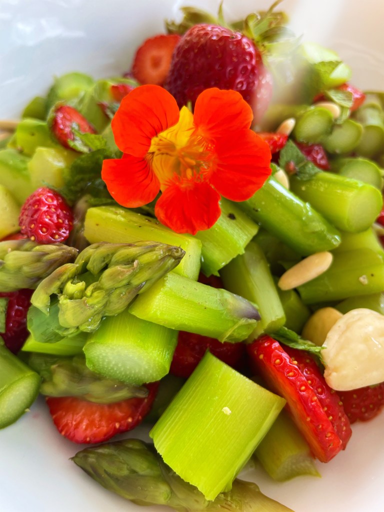 PortĂ©es une casserole dâeau salĂ©e Ă Ă©bullition et ajoutez-y les asperges lavĂ©es dont vous aurez prĂ©alablement coupez les parties dures Ă lâĂ©conome. Laissez-les cuire pendant 10 minutes et passez les de suite sous lâeau froide aprĂšs. Pendant la cuisson de ces derniĂšre lavez et coupez vos fraises đ en fines tranches. Dans un saladier associez vos fraises et vos asperges, ajoutez lâhuile dâolive, le jus de citron, la menthe ciselĂ©e les amandes et les pignons. Un peu de poivre si besoin, mais il nâest pas forcĂ©ment utile de saler. La touche finale est la capucine du jardin si vous en avez. Je les avez semĂ©s lâannĂ©e derniĂšre et jâai eu la joie de les retrouver cette annĂ©e, bien que mon jardin ai dĂ©mĂ©nagĂ© đ. Pour plus dâinfos sur la capucine câest ici: https://clolenaearth.com/2021/02/10/la-capucine/