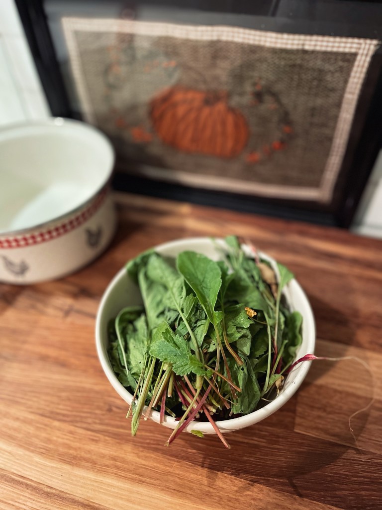 – Une belle poignée de fanes de radis fraîchement cueillis