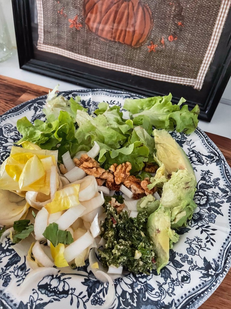 Étant donné les températures élevées de ce mois d’octobre, je mange encore pas mal de salades, j’ai donc choisi de rehausser rapidement ma salade automnale de midi avec un pesto de fanes de radis. Le gros avantage est que nous garderons bien tous les micronutriments intacts, puisqu’il n’y a pas de cuisson. Pour en revenir à ma salade, je n’ai donc pas eu à l’assaisonner avec de l’huile, j’ai simplement agrémenté les endives d’un filet de condiment blanc pour équilibrer le goût. Mais le sujet étant le pesto de fanes, je cesse les digressions et vous fournis ma recette improviser ci-dessous.