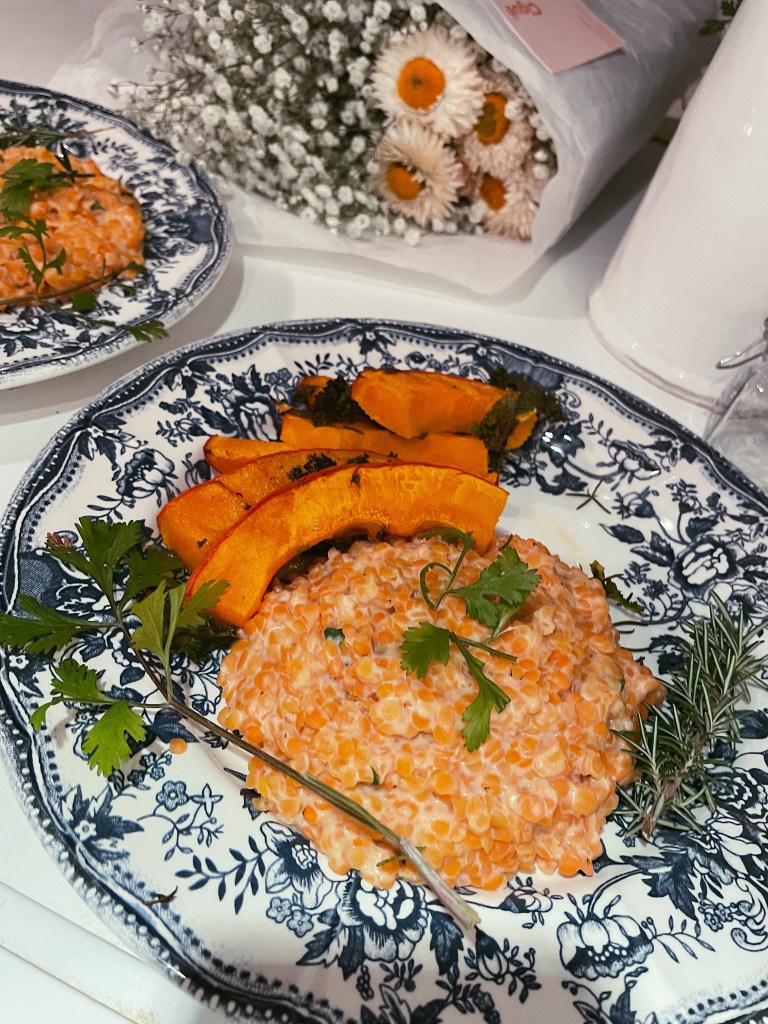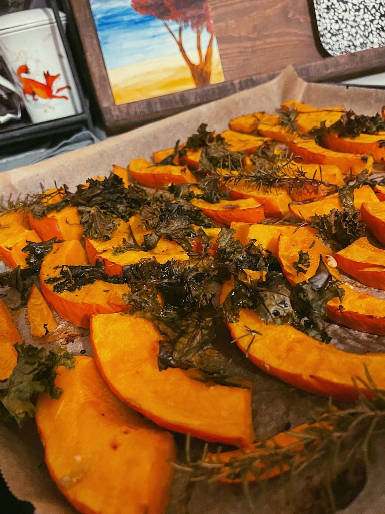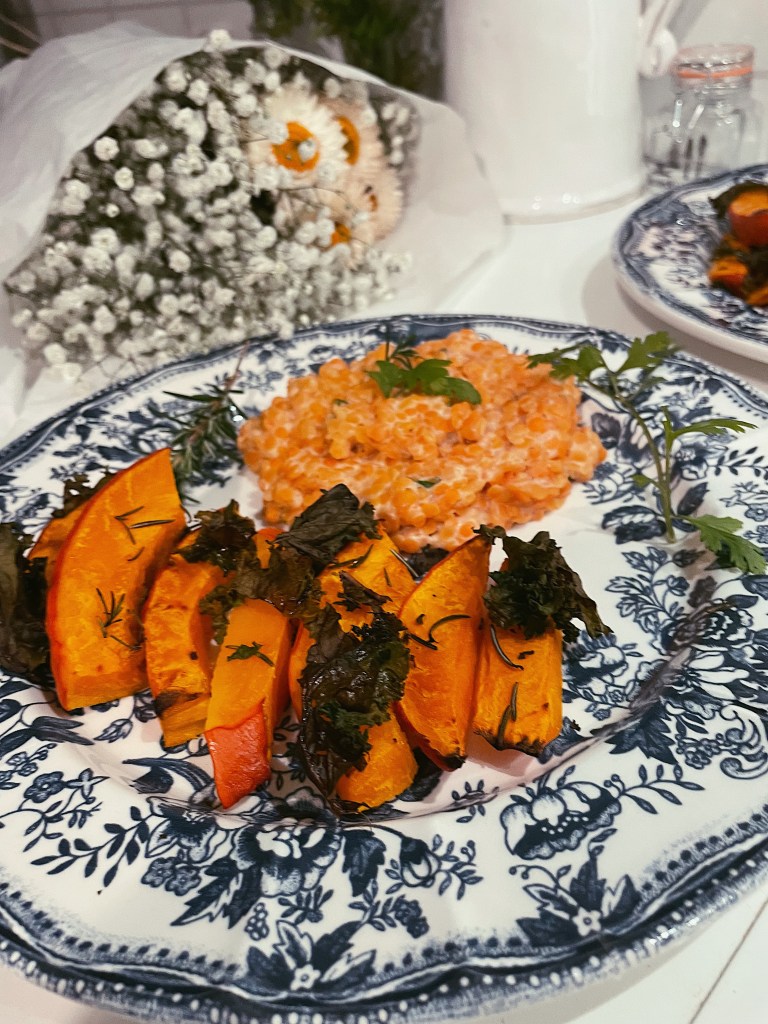 J’ai opté pour la lentille corail, plus rapide à préparer, plus digeste avec des notes plus douces un peu sucrés même et dont la couleur illumine un peu ces journées au temps gris. L’intérêt de la lentille couleur est qu’elle est riche en fibres et en protéines végétales bien sûr , elle apporte aussi du phosphore du zinc et du fer, très appréciés en cette période froide. Je vous propose de l’associer à un bon potimarron ( bêta carotène bonjour 👋 ) et au chou kale. Je n’insisterai pas sur les bienfaits de ces légumes d’autant qu’ils vont être rôtis d’où une perte de micro nutriments mais voici un article où je présente le chou kale: ici .