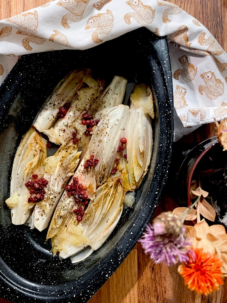 Commencez par presser votre bergamote et réservez le jus, puis épluchez la. Coupez les endives en 2 ou en 4 selon leurs tailles et dans un roaster huilé à l’huile de coco, ajoutez le sirop d’agave et ajoutez les endives avec un léger fond d’eau et faites les revenir. Arrosez avec le jus de bergamote pressé et parsemez d’airelles et de romarin avec une pincée de sel. Ajoutez les morceaux de bergamote que vous avez coupé dessus. Enfin enfournez le roaster fermé pendant 20minutes à 200 degrés. Humez la douceur subtilement sucrée qui se dégage du four. Bon appétit.