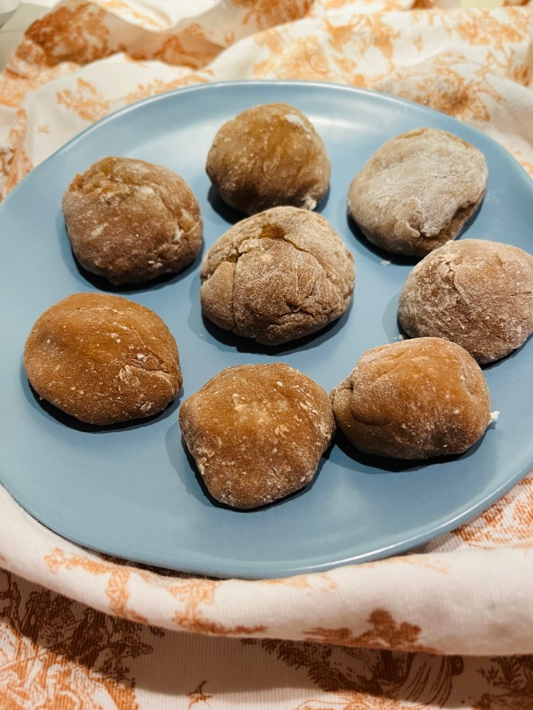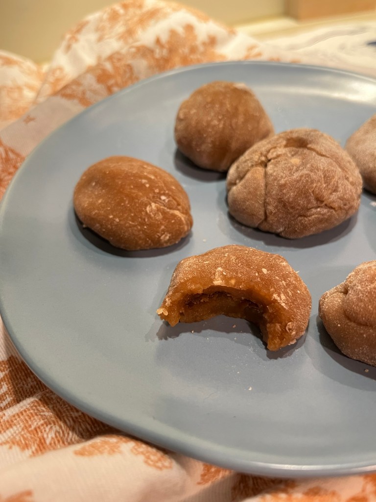 Revenons à notre pâte à mochis; saupoudrez un papier sulfurisé ou un plan de travail bien propre de fécule de pommes de terres ( très important, ne lésinez pas sur la quantité, car ça colle!) et placez-y votre pâte dessus. Prenez un peu de pâte et formez de tout petits pancakes avec vos mains dans lesquelles vous placerez un peu d’anko à l’intérieur. Refermez ce petit pancake en formant une boule que vous roulez entre vos mains. Votre premier mochi est prêt! On se salit encore un peu les mains pour les autres mochis et la dégustation arrive rapidement 😊. Je les conserve au réfrigérateur 2 jours, avant qu’ils ne durcissent.
