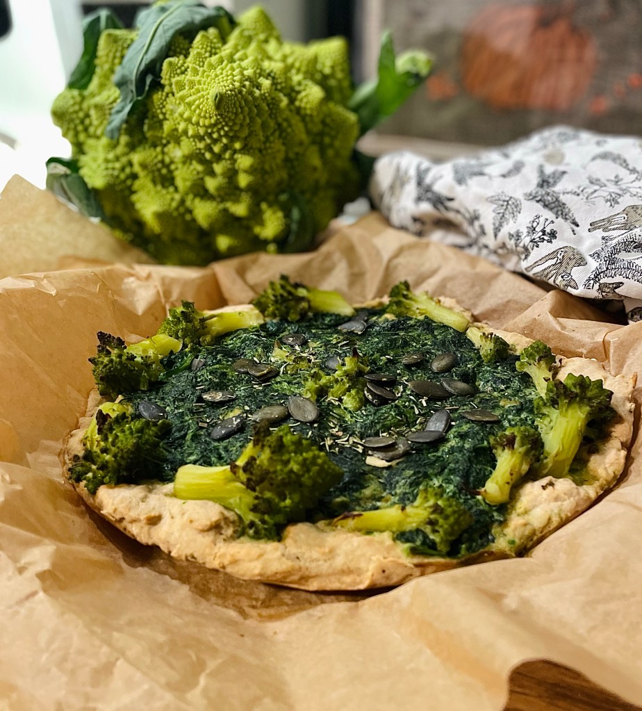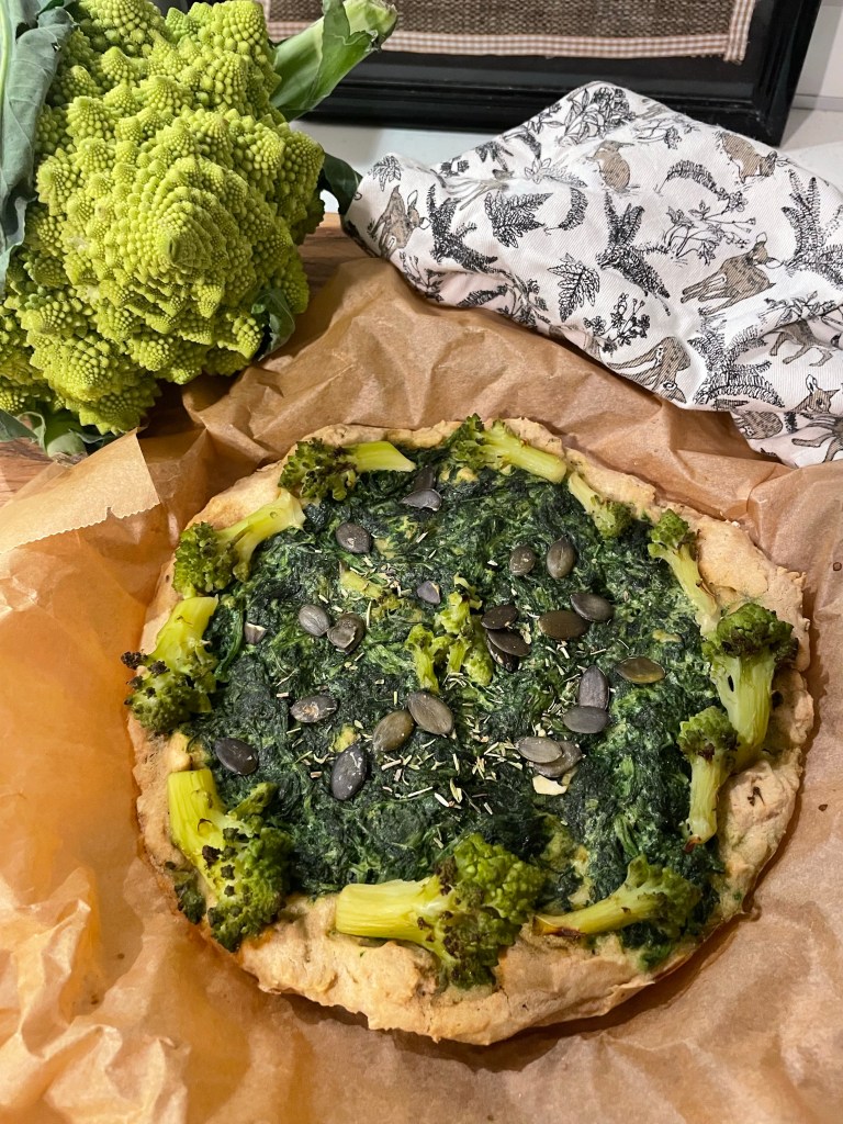 Pendant ce temps préparez votre pâte, en mélangeant tous les ingrédients secs dans un saladier ajoutez ensuite l’œuf, l’huile et 100ml d’eau tiède et pétrissez jusqu’à l’obtention d’une pâte homogène. Dans un plat à tarte agrémenté d’un papier sulfurisé, étalez votre pâte sans forcément chercher à faire les bords, et piquez-la avez une fourchette. Tapissez la tarte avec les épinards et gardez ce qu’il reste pour accompagnement. Disposez les fleurettes de chou romanesco dessus à votre guise et enfournez pour 30 minutes à 180C. A la sortie du four parsemez la tarte avec les graines de courge pour donner du croquant. Attendez que la tarte refroidisse un peu pour la couper et bon appétit 😋.