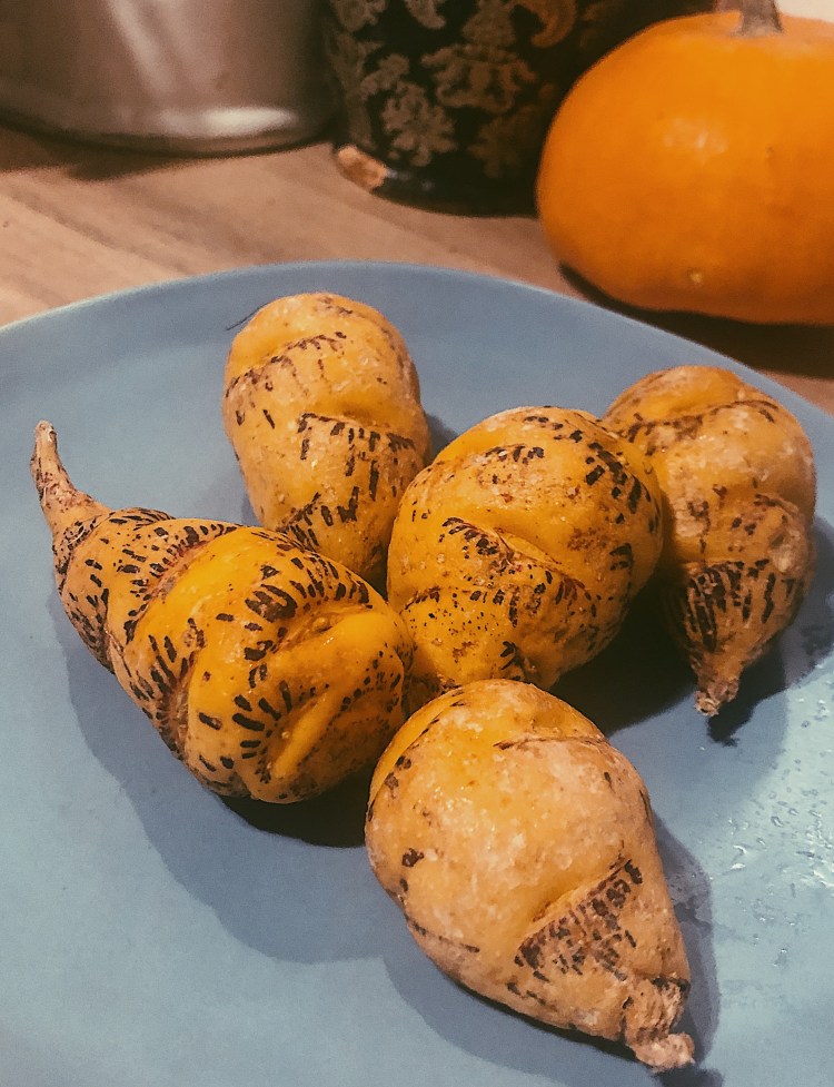 Je m’éparpille, donc pour revenir à la capucine tubéreuse, ses feuilles se consomment en salades ou comme des épinards cuits, ses fleurs jaunes orangées viendront égayer n’importe quel plat ( pour ma part je n’ai encore jamais expérimenté ces deux parties de la plante en cuisine).En revanche, j’ai découvert il y a peu son bulbe qui est un légume ancien, aussi appellé « Mashua » ou « Maswallo » et qui est délicieux. Sous cette forme, la capucine se consomme crue ou cuite, dans le cas où elle est dégustée crue, son goût est piquant et poivrée alors qu’une fois cuite, plutôt à la vapeur, son goût est beaucoup plus doux et se rapproche du marron avec une note sucrée subtile.