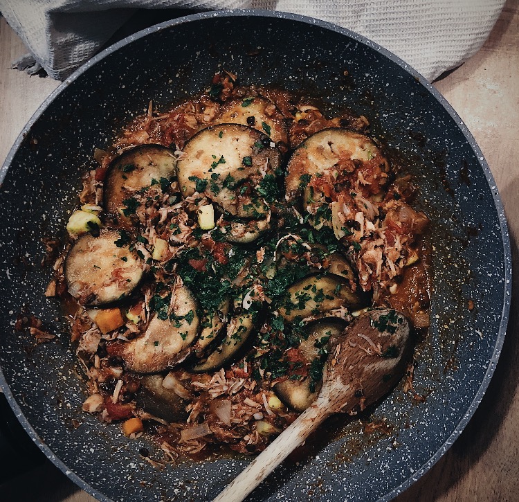 En parallèle, rincez et égouttez le Jackfruit que vous écraserez avec une fourchette afin de l’effilocher. Lavez vos blettes et coupez les finement. Ecrasez la gousse d’ail que vous mettrez dans une cocotte avec un fond d’huile d’olive en le faisant revenir quelques minutes. Ajoutez le Jackfruit, les blettes, les épices tandoori, le sel et un fond d’eau de source et laissez cuire à feu doux 20minutes.