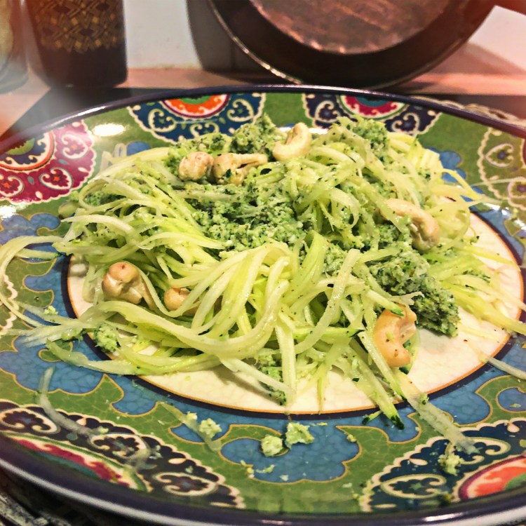 Ensuite détaillez vos courgettes en spaghettis avec un éplucheur à juliennes. Présentez dans une assiette, ajoutez le pesto de brocolis et quelques noix de cajou pour le croquant. C’est prêt, et je pense qu’il vous restera pas mal de pesto de brocoli, à manger en tartines pour se faire plaisir ;).