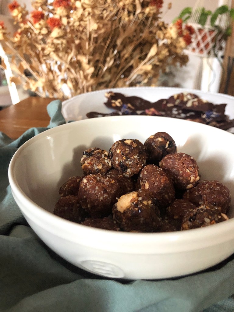 Souvent on me demande quels encas consommer en randonnée ou avant une course à pieds par exemple.La vérité est que je n’en prenais pas particulièrement, mais récemment une randonnée difficile au niveau du froid en particulier, m’a rappelé qu’avec un peu d’énergie pour se booster n’aurait pas été un luxe. Du coup j’ai pris la résolution de faire mes propres encas selon mes goûts en faisant mes énergy balls ou boules d’énergie.